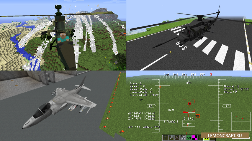 Вертолёты способны не только доставить вас в определённую точку, но и защитить. На борту расположены настоящие пулемёты и ракетницы. Если вы являетесь фанатом качественных дополнений и летательного транспорта, то непременно стоит скачать мод на вертолёты для Майнкрафт 1.7.10/1.7.2/1.6.4 - MCHeli и установить на клиент. В игру будет добавлен не только вертолёт, но и целых пять десятков летательных средств.